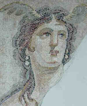 In Greek mythology , Tethys (Greek ), daughter of Uranus and Gaia [1] was an archaic Titaness and aquatic sea goddess , invoked in classical Greek poetry but no longer venerated in cult. Tethys was both sister and wife of Oceanus .[2] She was mother of the chief rivers of the world known to the Greeks, such as the Nile , the Alpheus , the Maeander , and about three thousand daughters called the Oceanids .[3] Considered as an embodiment of the waters of the world she also may be seen as a counterpart of Thalassa , the embodiment of the sea. Although these vestiges imply a strong role in earlier times, Tethys plays virtually no part in recorded Greek literary texts, or historical records of cults. Walter Burkert [4] notes the presence of Tethys in the episode of Iliad XIV that the Ancients called the "Deception of Zeus ", where Hera, to mislead Zeus, says she wants to go to Oceanus , "origin of the gods" and Tethys "the mother". Burkert [5] sees in the name a transformation of Akkadian tiamtu or tāmtu, "the sea," which is recognizable in Tiamat . Alternatively, her name may simply mean "old woman"; certainly it bears some similarity to meaning "grandmother ," and she is often portrayed as being extremely ancient (cf. Callimachus , Iamb 4.52, fr. 194). One of the few representations of Tethys that is identified securely by an accompanying inscription is the Late Antique (fourth century CE) mosaic from the flooring of a thermae at Antioch , now at the Harvard Business School in Boston , Massachussetts [6] after being moved from Dumbarton Oaks .[7] In the Dumbarton Oaks mosaic, the bust of Tethys\emdash surrounded by fishes\emdash is rising, bare-shouldered from the waters. Against her shoulder rests a golden ship's rudder. Gray wings sprout from her forehead, as in the mosaics illustrated above and below.