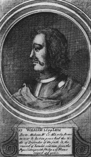 • Acceded, 24 Dec 1165, Scone Abbey, Perthshire, England. William married daughter Avenal [11788] [MRIN: 3728]. William next married Ermengarde de Beaumont Queen Consort of the Kingdom of Scotland [12115] [MRIN: 5566], daughter of Richard de Beaumont Viscount de Beaumont [11272] and Lucie of L'Aigle [12510], on 5 Sep 1186 in Woodstock Palace, Oxfordshire, England. (Ermengarde de Beaumont Queen Consort of the Kingdom of Scotland [12115] was born about 1170, died on 11 Feb 1233 and was buried in Balmerino Abbey, Fife.) |
