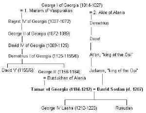 ![]() David married Tamar I the Great of Georgia Queen of Georgia [9211] [MRIN: 3912], daughter of George III of Georgia [63856] and Burdukhan of Alania [63857]. (Tamar I the Great of Georgia Queen of Georgia [9211] was born about 1160 and died on 18 Jan 1213.) |