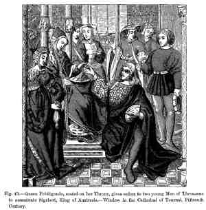 Fredegund is said to be responsible for the assassination of Sigebert I in 575 and made attempts on the lives of Guntram (her brother-in-law and the king of Burgundy ), Childebert II (Sigebert's son), and Brunhilda.