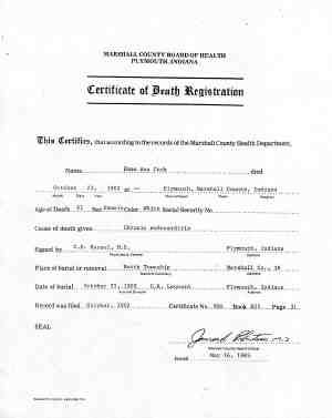 Emma Ann Cook, Female, White, Widow of William Cook, age 61 died near LaPaz, Marshall County, Indiana on October 23, 1902 of Cronic endocarditis. She was born in Ohio, Died in North Township, Marshall County, Indiana. Her father--(no 1st name recorded) Kyle. Birth place, mother not known.